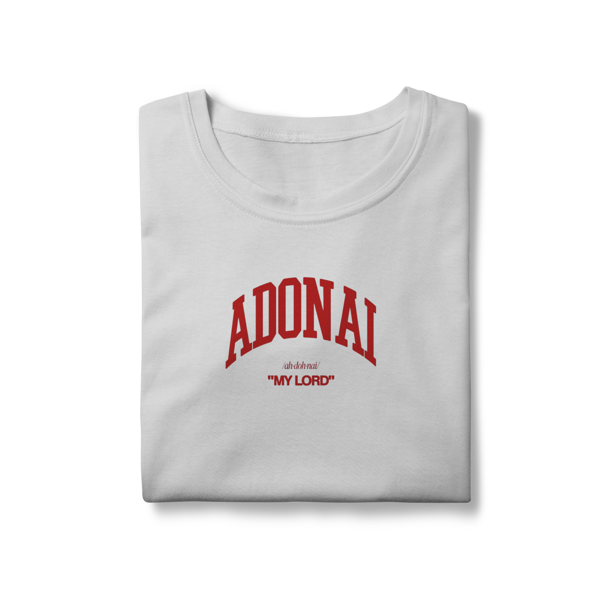 Adonai é um dos nomes mais reverentes para se dirigir a Deus. Esta camiseta traz essa declaração com força visual e simplicidade.