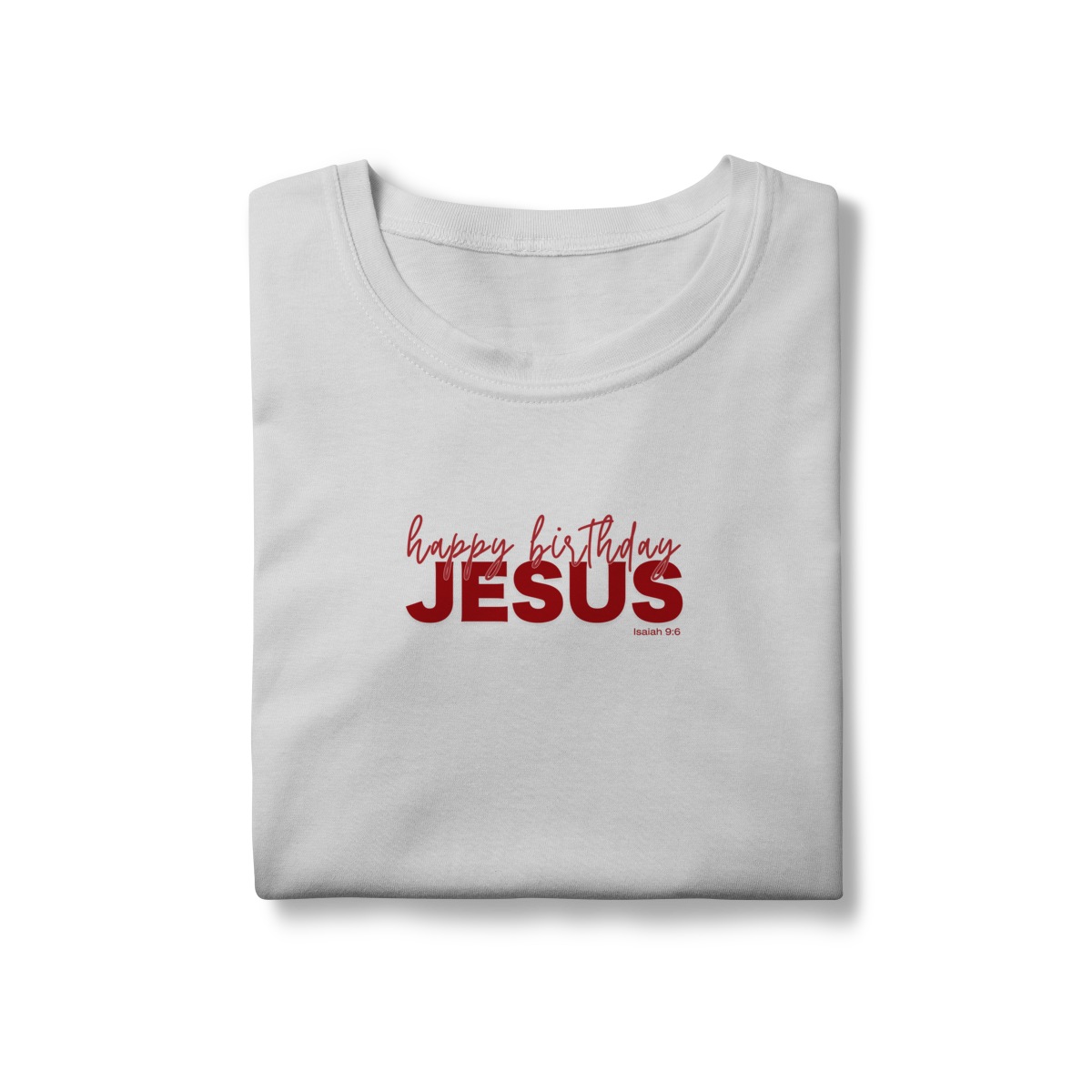 Celebre o verdadeiro Natal com a camiseta “Happy Birthday Jesus”. Presente cristão perfeito para homens e mulheres que amam Jesus. Minimalista, moderna e cheia de fé.